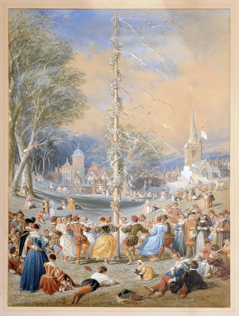 Lors du premier quartier de lune de mai, nous fêtons la floraison et la puberté. On dresse un arbre de mai recouvert de rubans et de fleurs, autour duquel les jeunes hommes et femmes célibataires dansent. Le symbolisme de l’arbre de mai est complexe : on peut le voir comme un avatar de l’Arbre-monde (ou Axis Mundi), comme une représentation sexuelle où la ronde représente l’étreinte du kteis autour du phallus… La fertilité est la base de la cérémonie et les jeunes couples partagent des coupes d’alcool ensemble. Les jeunes gens s’adonnent à des jeux de force et de courage pour impressionner les jeunes filles, et ces dernières dansent et chantent.